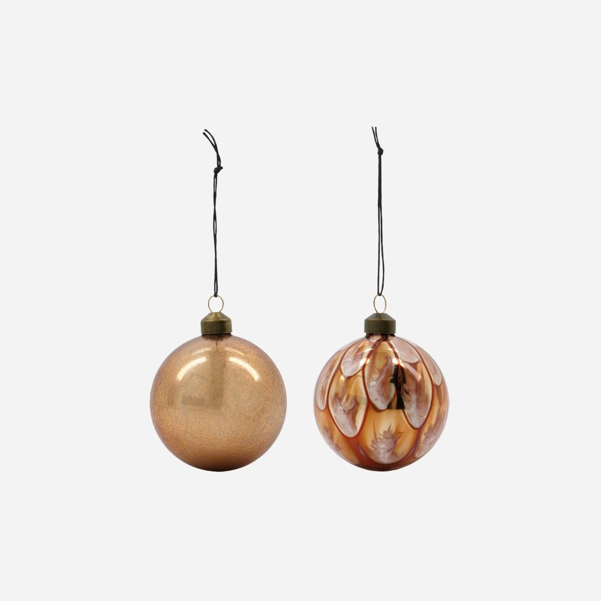 Set aus zwei verschiedenen Glaskugeln für einen eleganten Look am Weihnachtsbaum. Die Weihnachtskugeln Runy präsentieren sich in einem edlen Messing-Finish und sind mit matten Metallkappen verziert, die einen Hauch von Vintage-Feeling ausstrahlen.