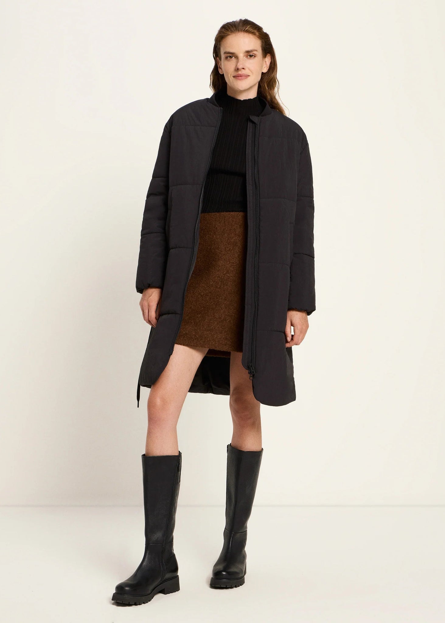 Leicht, clean und perfekt für die Übergangszeit und kühlere Tage: Der wattierte Mantel aus recyceltem Polyamid-Crêpe überzeugt durch seine moderne, gerade Silhouette und die matte, strukturierte Oberfläche. Der Bindegürtel ermöglicht eine flexible Taillierung, während die dezente Steppung und die leichte Wattierung angenehme Wärme ohne Schwere bieten. Mit Zwei-Wege-Reißverschluss, seitlichen Eingrifftaschen und kleinem Stehkragen wird der Mantel zum idealen Begleiter zwischen den Jahreszeiten – vielseitig kombinierbar von casual bis elegant.