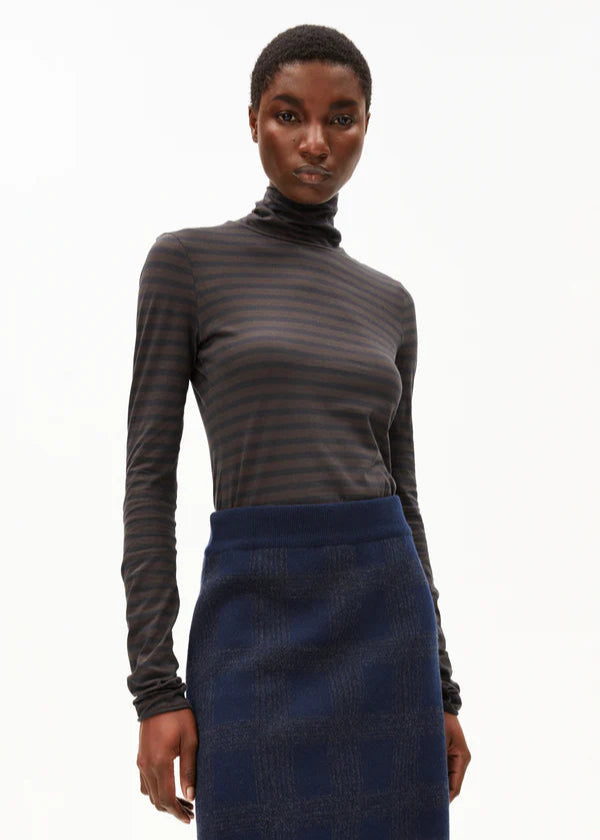 mit Rollkragen, langen, schmalen Ärmeln, offenem Saum, Streifenmuster und schmaler Silhouette