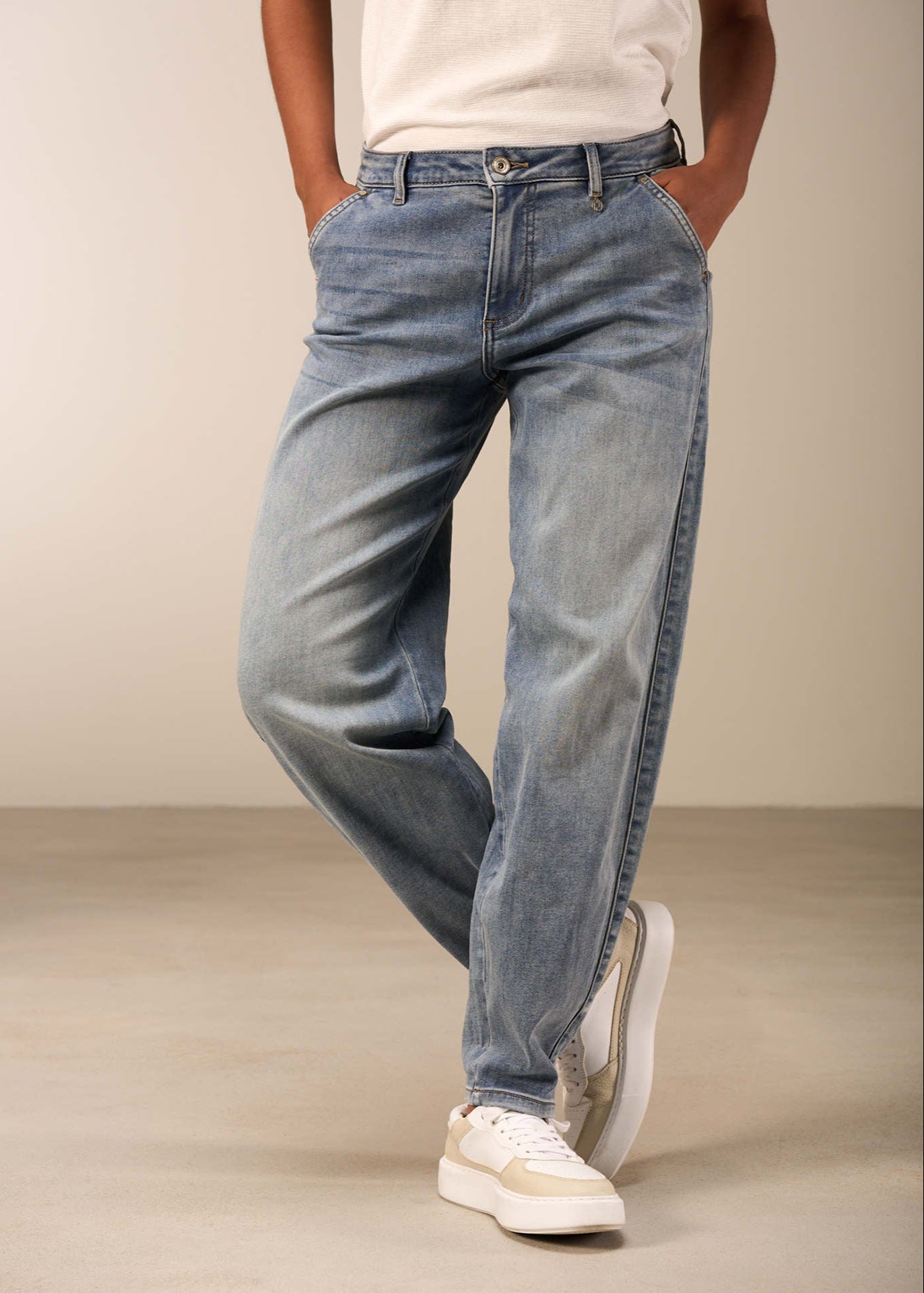 Locker sitzende Hose mit mittelhohem Bund in angesagter O-Shape-Form. Die Hosenbeine sind gekrempelt und Dekobänder am Umschlag werten die Jeans zusätzlich auf. Unregelmässigkeiten in der Farbe und ein verstärkter Ausbleicheffekt sind gewollt und machen das Stück einzigartig. Das Produkt kann auf Kleidung und Oberflächen abfärben.