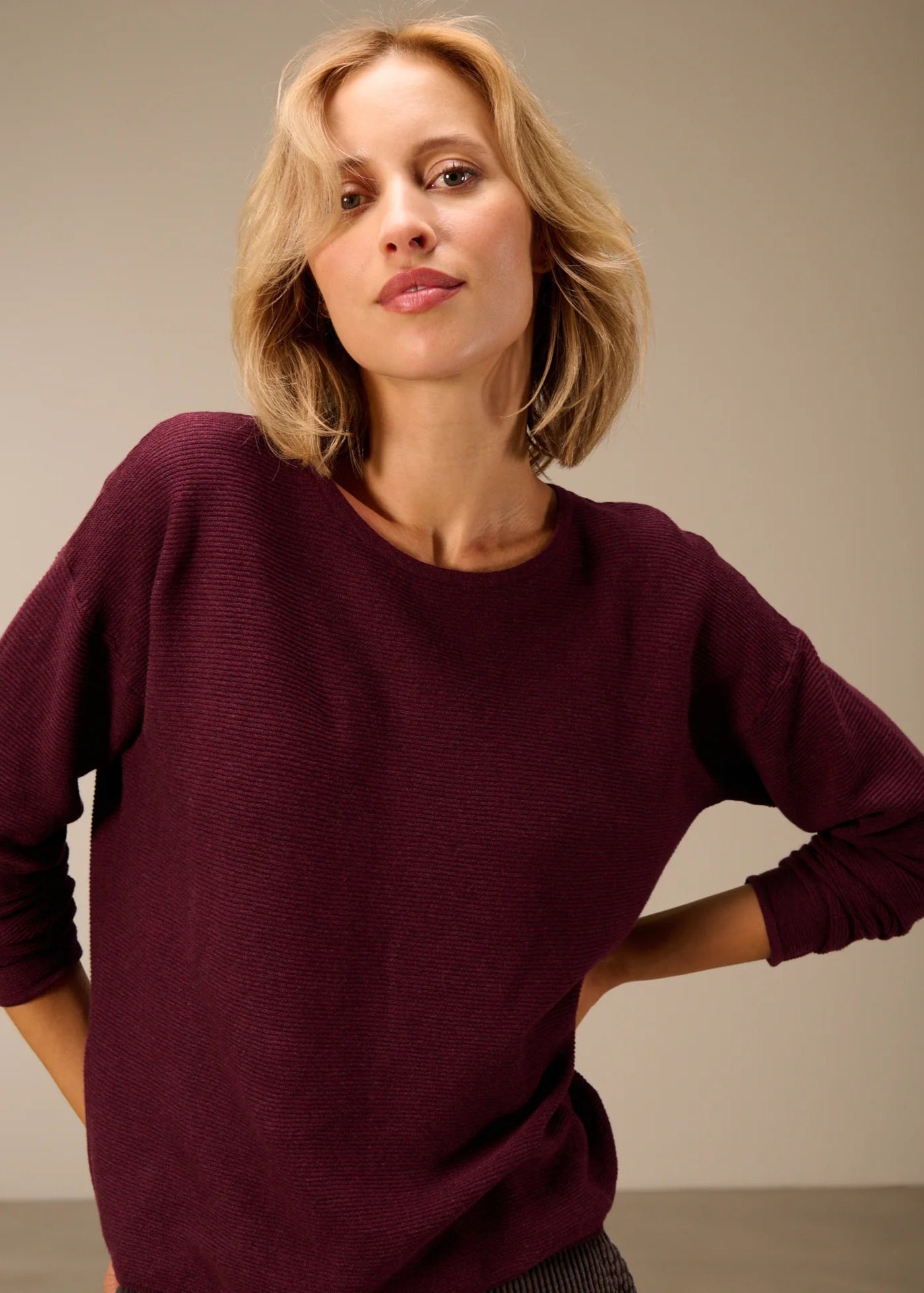 Lockerer Strickpullover mit Rundhalsausschnitt in Querrippen Optik, überschnittenen Schultern, langen, schmalen Ärmeln, gerader Silhouette und separatem Kragen