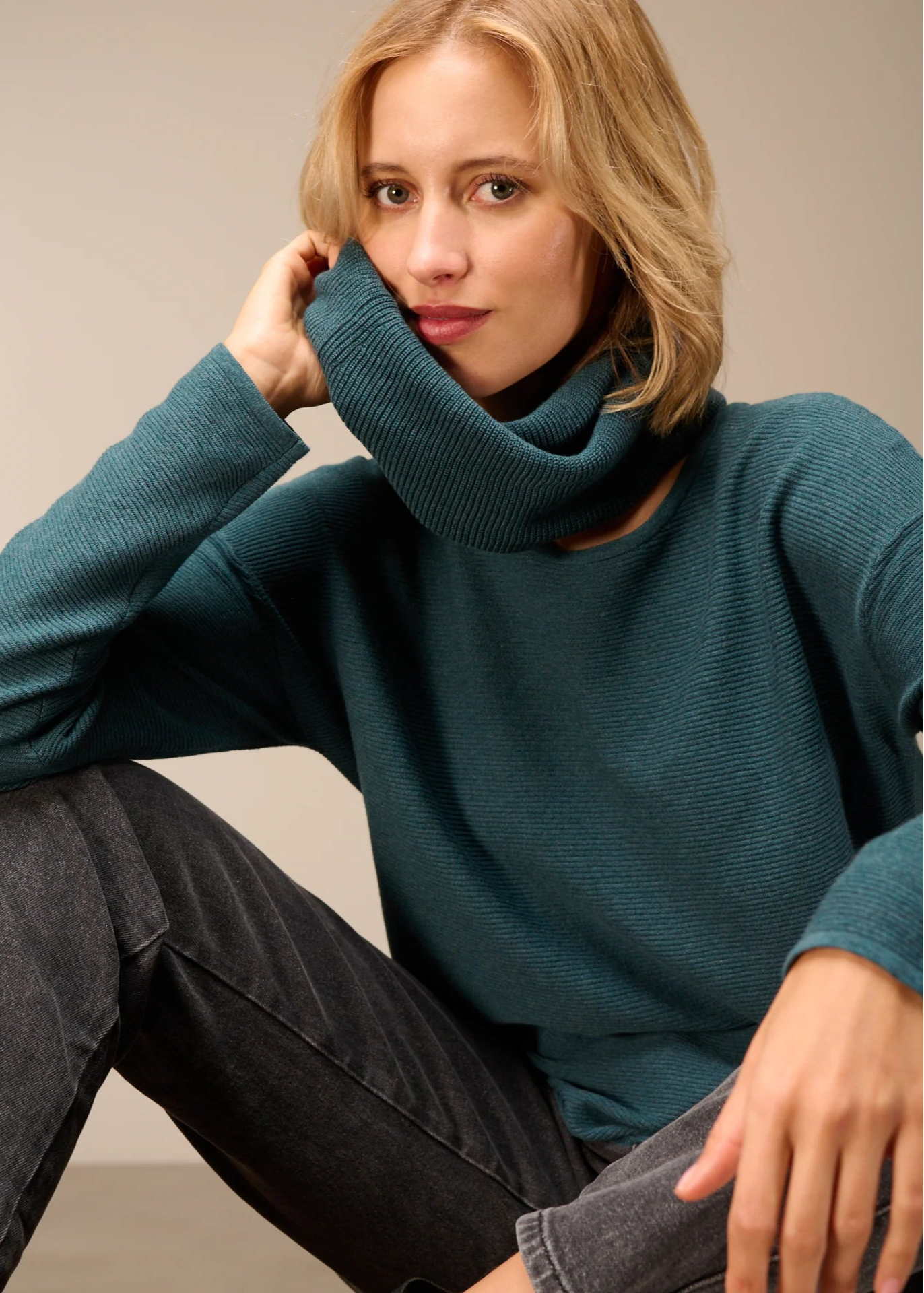 Lockerer Strickpullover mit Rundhalsausschnitt in Querrippen Optik, überschnittenen Schultern, langen, schmalen Ärmeln, gerader Silhouette und separatem Kragen