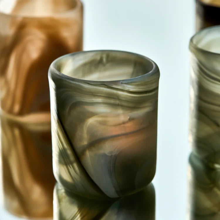 Das graue, marmorierte Muster sorgt für einen modernen Blickfang und reflektiert das Kerzenlicht auf besonders stimmungsvolle Weise. Ob im Wohnzimmer, Essbereich oder Badezimmer – diese Teelichthalter setzen dezente Akzente und schaffen eine warme Atmosphäre. Stilvoll einzeln, im Duo oder im kreativen Mix mit anderen Kerzenhaltern arrangierbar.