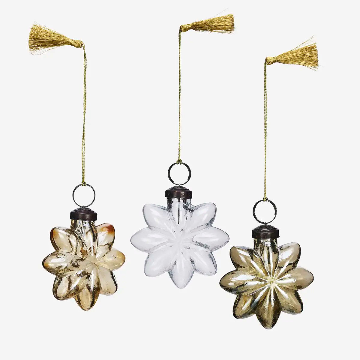 Die hängenden Glassterne wurden aus teilweise recyceltem Glas hergestellt. Mit goldenen Schnüren und Quasten versehen, bieten diese Sterne schimmernde Amber-, und Smoketöne und eignen sich ideal für festliche Dekorationen mit einem klassischen und dennoch modernen Touch.