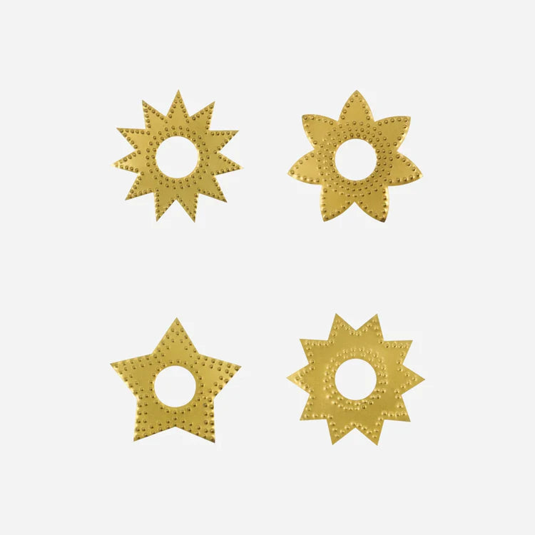 Handgefertigte Kerzenringe mit antikem Messing-Finish bieten Eleganz und Gemütlichkeit. Die vier einzigartigen Designs mit gestempelten Mustern reflektieren das