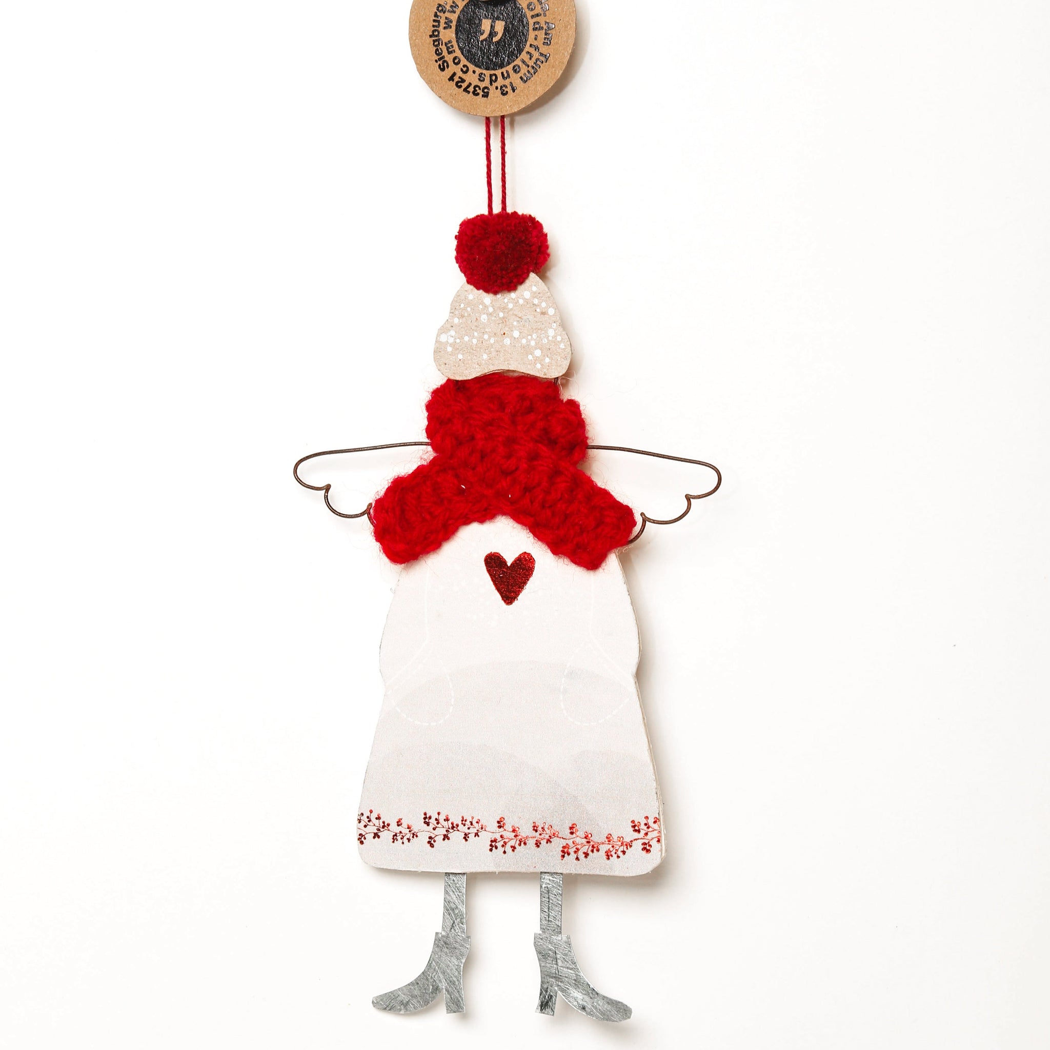 Material:  Engel aus Draht und bedruckter Pappe, mit Strickschal, Mütze mit PomPom