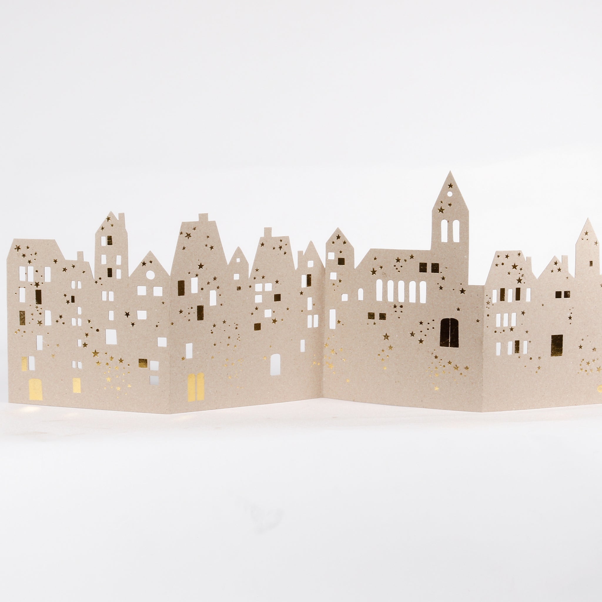 Klappbar. Im Handumdrehen eine zauberhafte Fenster- oder Tischdekoration mit winterlicher Stimmung. Ein Winterwald mit Sternen, eine hell erleuchtete Stadt, Lebkuchenhäuser oder ein Wichtelhaus schaffen im Nu eine liebevolle Dekoration.