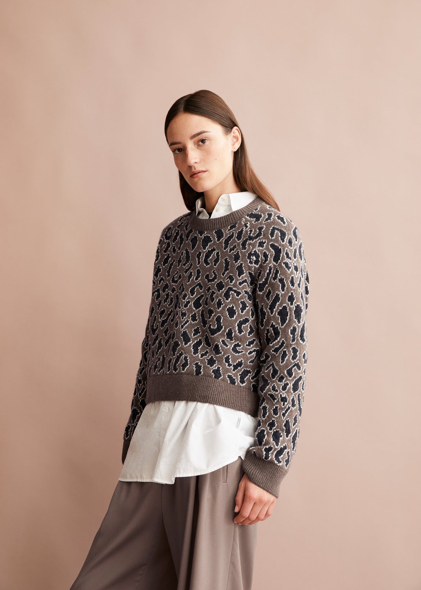 DerbDILIRIAA LEOPAA Strickpullover aus Grobstrick mit Jaquard Print hat einen kurzen, bequemen Schnitt. Er ist aus Bio-Wolle und recycelter Wolle gefertigt, wodurch er warm und weich bleibt.